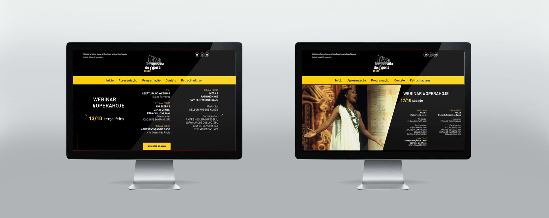Criação de Marca e Identidade Visual para a Temporada de Ópera 2020, pela primeira vez transmitida totalmente on-line. Anúncio de revista, Peças para mídias digitais e Sinalização externa.