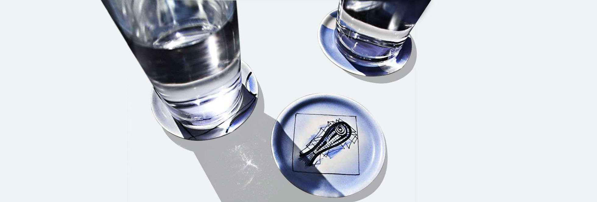 O tema é em homenagem à cidade de Belo Horizonte, convite para evento acompanhado de peças de cerâmica pintadas à mão, com desenhos baseados nas pinturas de Cândido Portinari para a Igreja de São Francisco de Assis, na Pampulha.