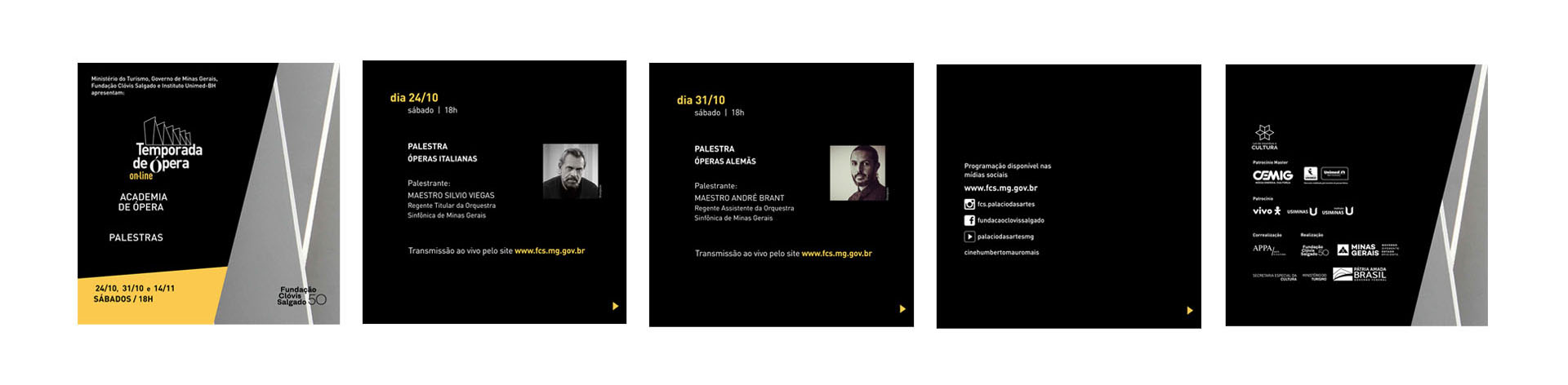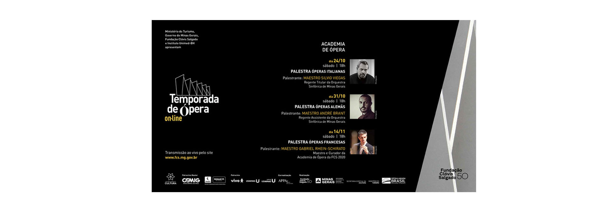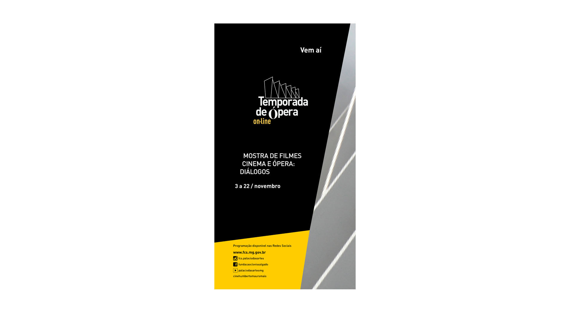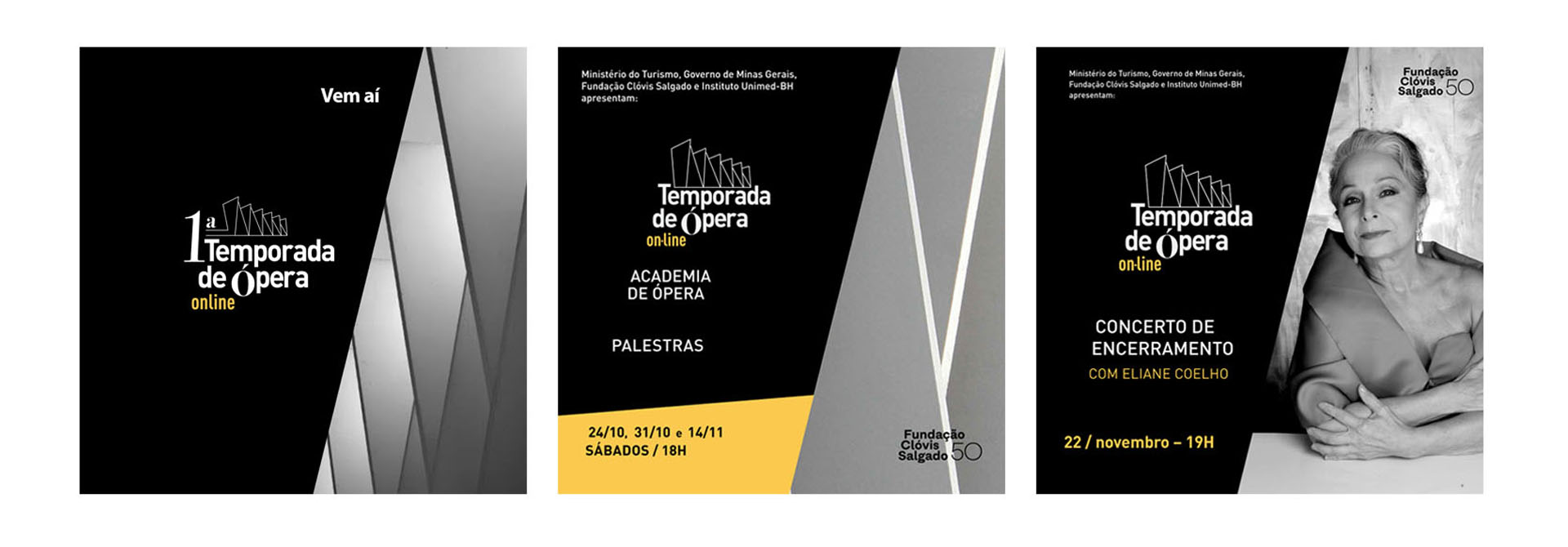 Criação de Marca e Identidade Visual para a Temporada de Ópera 2020, pela primeira vez transmitida totalmente on-line. Anúncio de revista, Peças para mídias digitais e Sinalização externa.